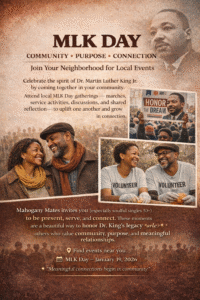 This MLK Day, Mahogany Mates encourages you to show up in your own neighborhood, sporting MM gear and honor Dr. King’s legacy through connection and community. Local MLK events—marches, service projects, discussions, and gatherings—bring together people who care about justice, love, and collective progress. These are the kinds of spaces where meaningful conversations happen naturally and values are shared in real time. Whether you come with friends or on your own, attending a local MLK event is a chance to build community, live out purpose, and maybe even meet someone who is also committed to growth, service, and being part of something bigger—exactly what Mahogany Mates is all about. So find an event thats near and dear to your heart attend, wear the gear and watch the sparks fly.